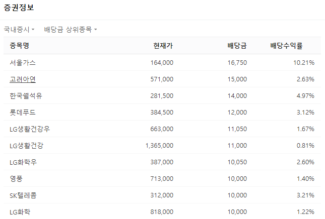 네이버에서 "배당금" 검색하시면 아래와 같이 배당금 상위 종목 또는 배당수익률 상위 종목 등 원하는 것으로 검색이 가능합니다.