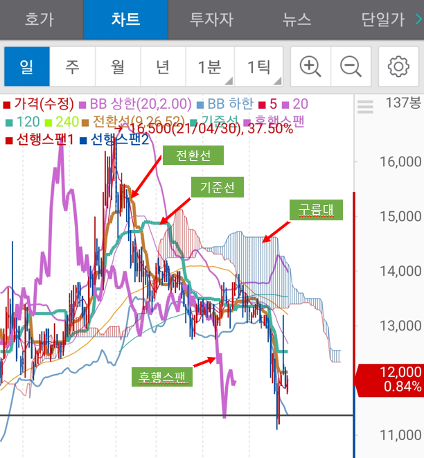 - 후행스팬이 주가를 하향돌파하면 매도시점.
