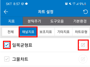 [지표 - 채널지표 - 일목균형표 체크 - 설정 클릭]