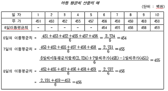 매일의 종가(終價)를 기준으로 하여, 가장 최근의 종가부터 산출하고자 하는 기간 동안의 종가를 합하여 산술 평균하면 된다. 가령 6일 주가 이동 평균선을 작성하고자 한다면, 기준일의 종가를 포함해서 최근 6일간의 합계를 6으로 나눈 것이 기준일의 이동 평균치이며, 기준일 다음날의 이동 평균치는 기준일까지의 6일간의 합계에서 기준일 다음날의 종가를 더하고 7일 전의 종가는 뺀 후 6으로 나누면 된다. 이렇게 해서 나온 점들을 선으로 연결한 것이 이동 평균선이다. 다만 유·무상 증자의 경우 종합주가 지수에서는 권리락이 실제로 수정되기 때문에 이동 평균치를 산출할 때 별 문제가 없으나, 개별 주가를 대상으로 할 때에는 주가의 갭(gap)이 생기기 때문에 이를 수정해 주어야 한다.