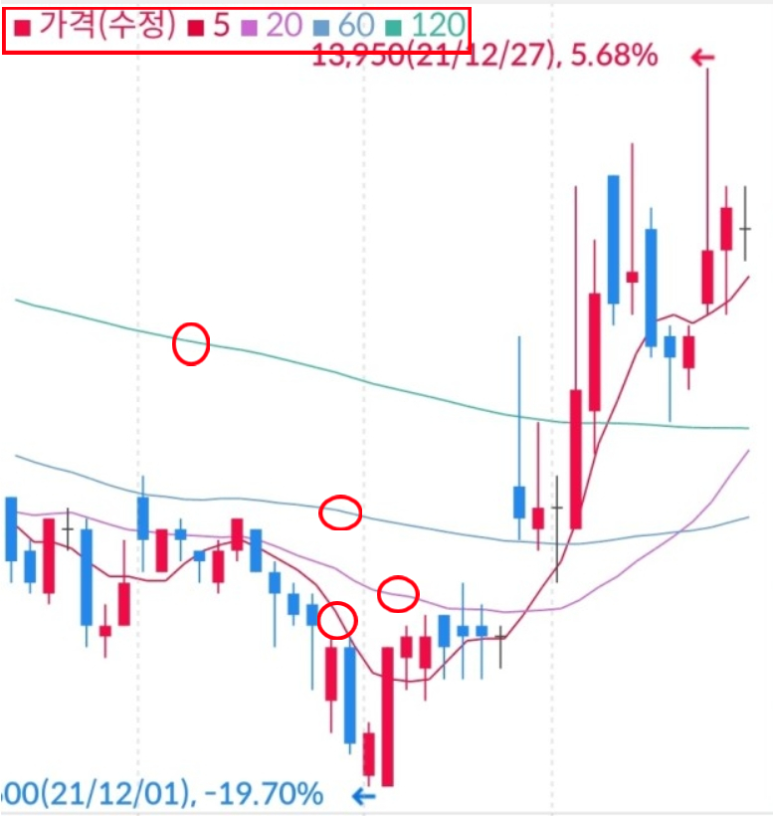 그리고 사각형 빨간색이 5일, 20일, 60일 .. 을 표현한 것이고요.