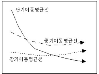 중기 및 장기의 이동 평균선이 상당 기간 진행된 후 단기 이동 평균선이 더 이상 하락하지 않고 상승하기 시작하면 바닥권이 예상되는 시점이다.