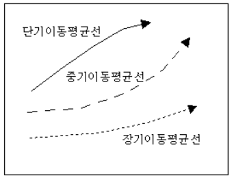 이동 평균선에는 주가 이동 평균선과 거래량 이동 평균선이 있는데, 주가 이동 평균선은 일정한 기간의 주가 평균치의 진행 방향과 매일의 주가가 어떤 관계에 있는가를 분석함으로써 향후의 주가 동향을 예측하고자 하는 지표이다. 이동 평균선은 단기선(25일 선), 중기선(75일 선), 장기선(150일 선)으로 나눌 수 있다.