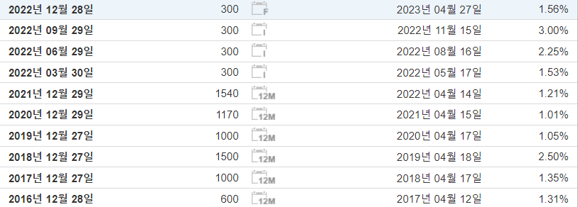 작년 배당이 올해 나왔네요. 2023년 4월 27일 300원..