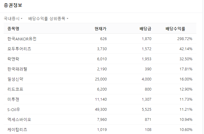 네이버에서 "배당금" 검색하시면 아래와 같이 배당금 상위 종목 또는 배당수익률 상위 종목 등 원하는 것으로 검색이 가능합니다.