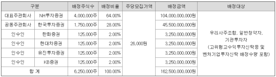 - 주간사 : NH투자증권, 한국투자증권, 한화증권, 현대차증권, 유진투자증권, KB증권