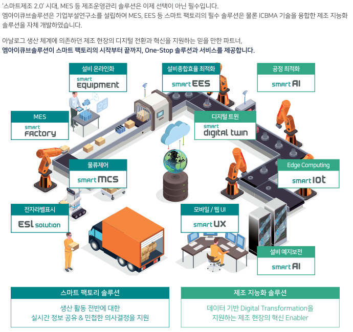 제조실행시스템(MES)의 필요성이 가장 먼저 대두된 전기·전자 업종에서 오랜 시간 축적해 온 엠아이큐브솔루션의 스마트 팩토리 구축 노하우는 첨단 ICT 기술과 융합하여 여러분의 제조 현장을 혁신할 최고의 Enabler가 될 것같습니다.