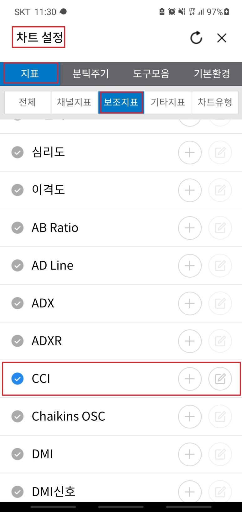 2. 차트설정 - 지표 - 보조지표 - CCI 선택