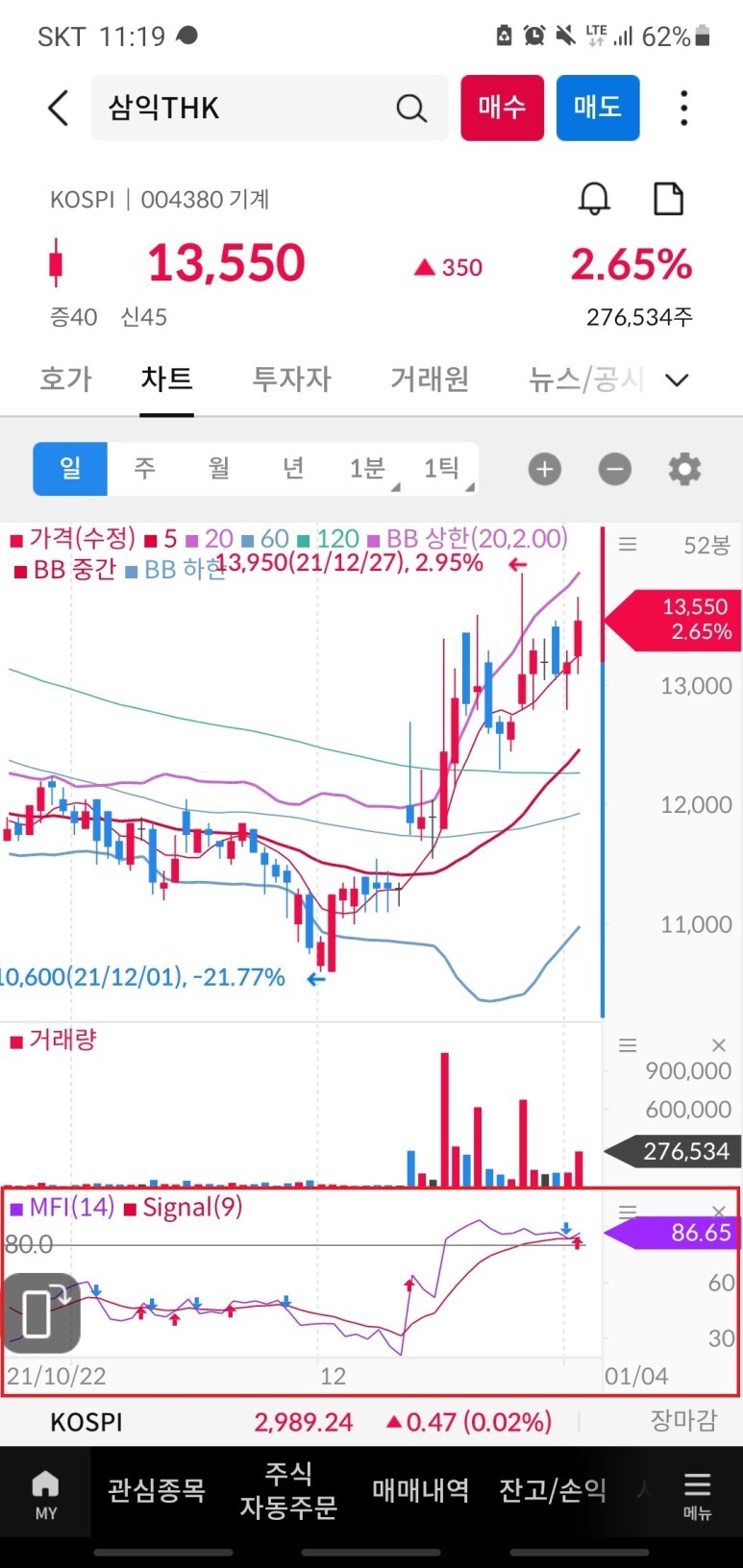 즉, 주가가 상승하고 있는데 MFI는 하락한다면 주가 하락 반전의 가능성이 높아지고 있다고 볼 수 있다.